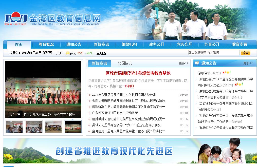 珠海市金灣區(qū)教育信息網(www.jwjy.net)是由金灣區(qū)教育局主辦的教育門戶網站, 是金灣教育在互聯(lián)網上對外展示的窗口,是發(fā)布金灣區(qū)權威教育信息、公開教育黨務、政務信息的重要平臺,是廣大師生、家長和社會公眾了解金灣教育、關注金灣教育的網絡媒介。金灣區(qū)教育信息網自2013年7月上線以來,充分整合政府信息資源,實現(xiàn)教育資源教育信息共享,為金灣區(qū)電子政務乃至珠海市在地區(qū)教育局門戶領域樹立領先形象,極大提高金灣區(qū)在相關領域的技術水平和管理服務理念,成為金灣區(qū)電子政務的中堅力量,真正做到“全心全意為人民服務”。