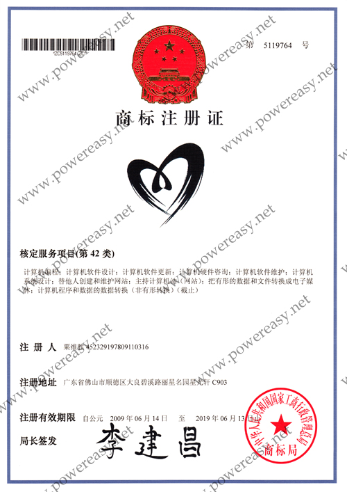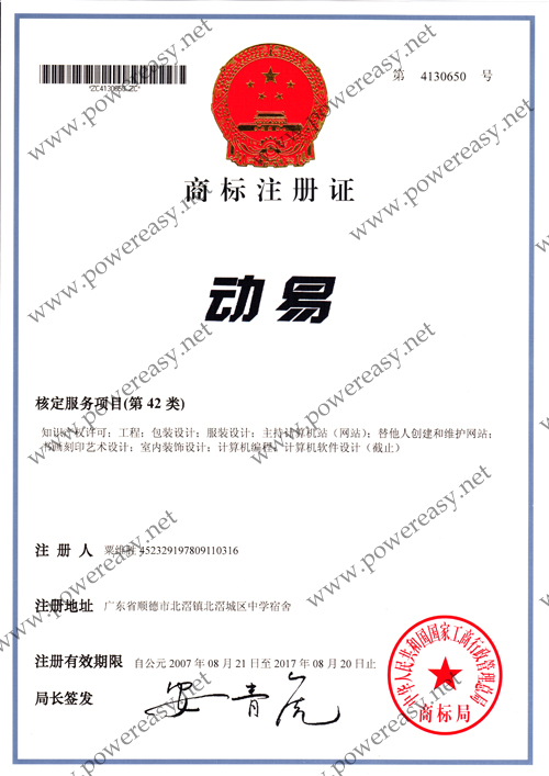 “PowerEasy”商標(biāo)注冊證