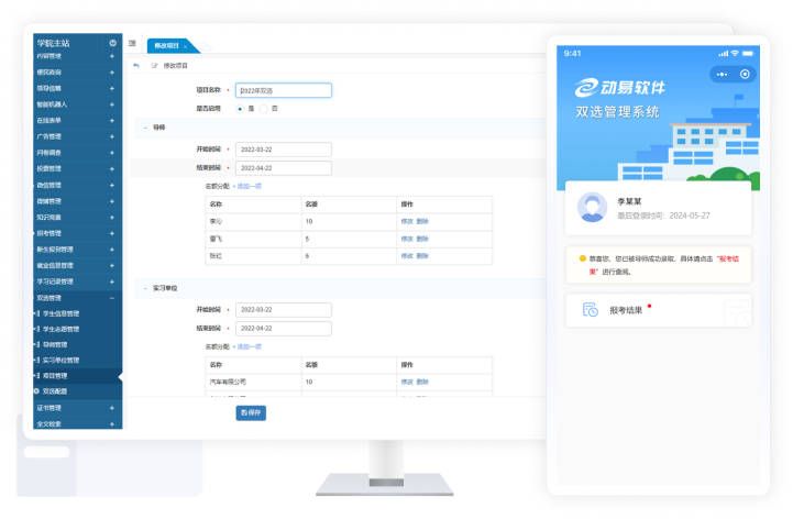 支持設(shè)置項目信息,包括設(shè)置項目的開始時間和結(jié)束時間,以及學生可以選擇的導師和實習單位,以及相應的名額。