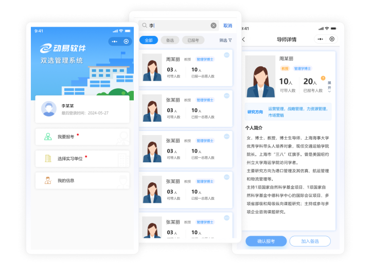 在小程序主頁點擊“我要報考”后,系統(tǒng)將展示導師列表,學生可以根據(jù)職稱、學歷、研究方向等條件篩選導師。點擊導師名稱可以查看其詳細信息以及報考該導師的相關(guān)數(shù)據(jù)。學生可以將導師加入備選或取消備選,并最終確認報考。