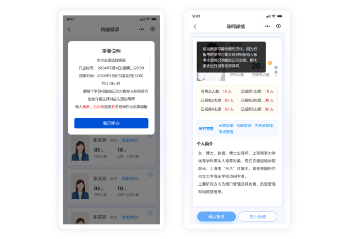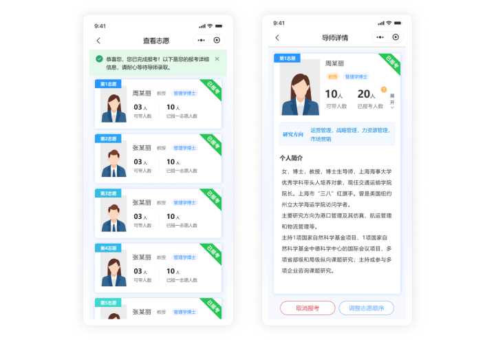 在報考截止時間之前,學生可以隨時查看和調(diào)整報考志愿,包括取消報考或通過拖拽方式調(diào)整志愿順序。每個導師的報考名額有配置限制。