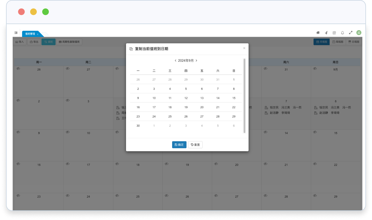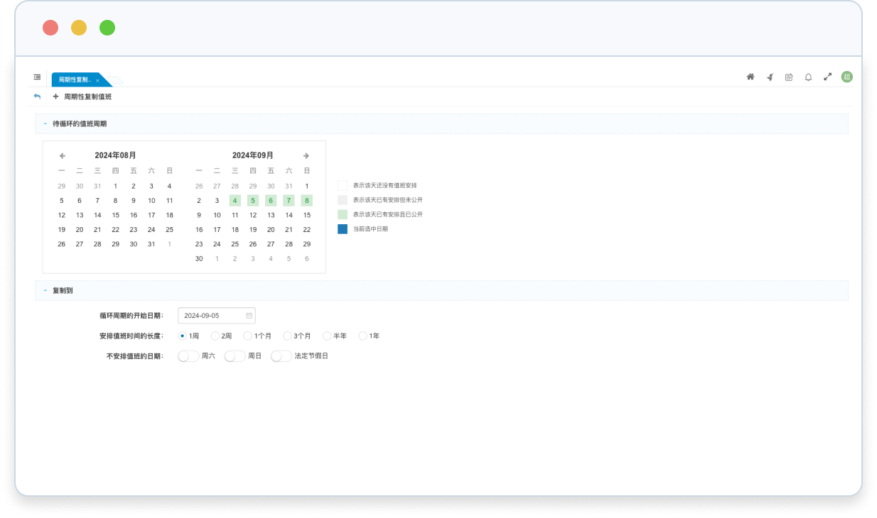 - 支持將某一天已排好的值班信息復(fù)制到其他日期,以便在多天排班信息相同時一步完成,提高排班效率。