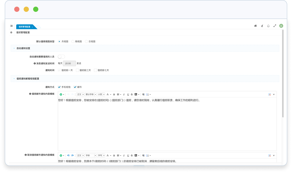- 支持在值班前一天/三天/七天自動給值班人員發(fā)送值班通知。通知方式支持郵件和手機(jī)短信,通知內(nèi)容支持自定義。