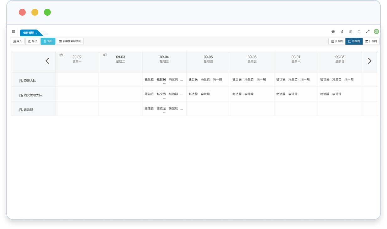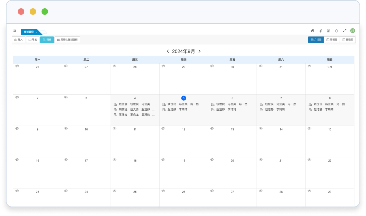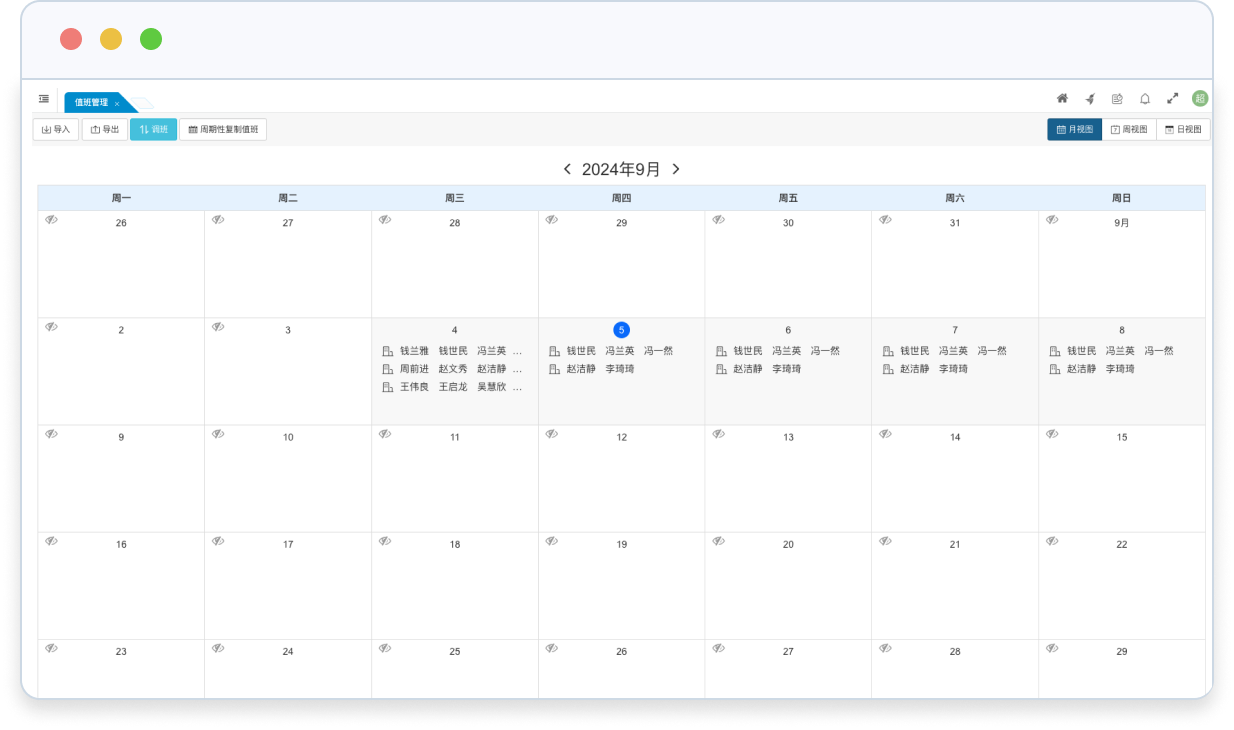- 所見即所得的排班界面,提供日/周/月視圖排班模式,適配不同規(guī)模人員調(diào)度;