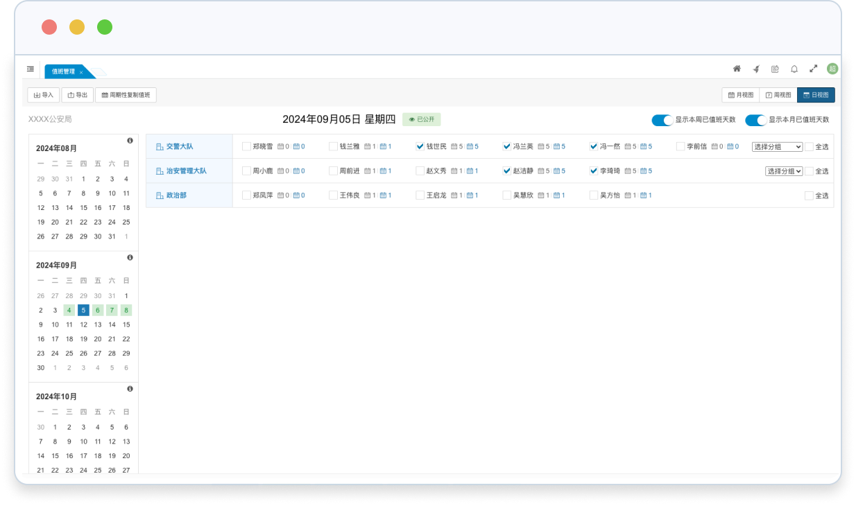 - 排班時,支持按日期為每個部門設(shè)置值班人員,支持在設(shè)置值班人員時直觀查看有關(guān)人員的當(dāng)周值班情況和當(dāng)月累計值班天數(shù),以幫助排班人員做出更好的決策。