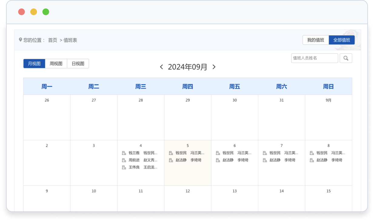 - 值班信息列表頁與后臺相同,提供月視圖模式來顯示每月的值班信息,提供周視圖模式來展示每周的值班信息,提供日視圖來查看指定日期的值班表,并且支持在月視圖、周視圖、日視圖之間自由切換。用戶還可以從月視圖或周視圖中點(diǎn)擊查看特定日期的值班表,支持按人名搜索值班安排,且能夠同時搜索多個人。
