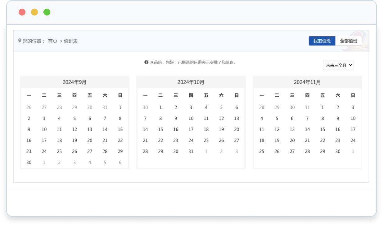 - 支持“我的值班”,當(dāng)用戶已登錄時,可訪問“我的值班”頁面,頁面以日歷方式顯示當(dāng)前用戶的值班安排。