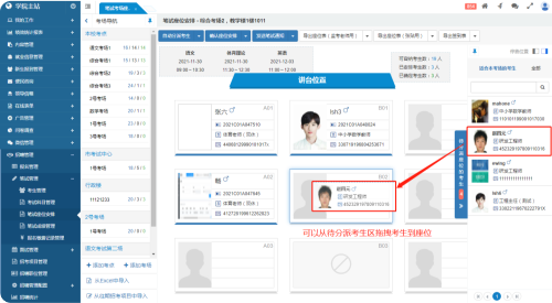 提供座位調(diào)整、自動(dòng)分派考生座位、手動(dòng)分派考生、確認(rèn)座位安排、導(dǎo)出座位表(監(jiān)考老師用)、導(dǎo)出座位表(張貼用)、導(dǎo)出簽到表功能。以及為所有考場自動(dòng)分派考生、確認(rèn)所有考場的座位安排、導(dǎo)出所有考場的座位表(監(jiān)考老師用)、導(dǎo)出所有考場的座位表(張貼用)、導(dǎo)出所有考場的簽到表操作。