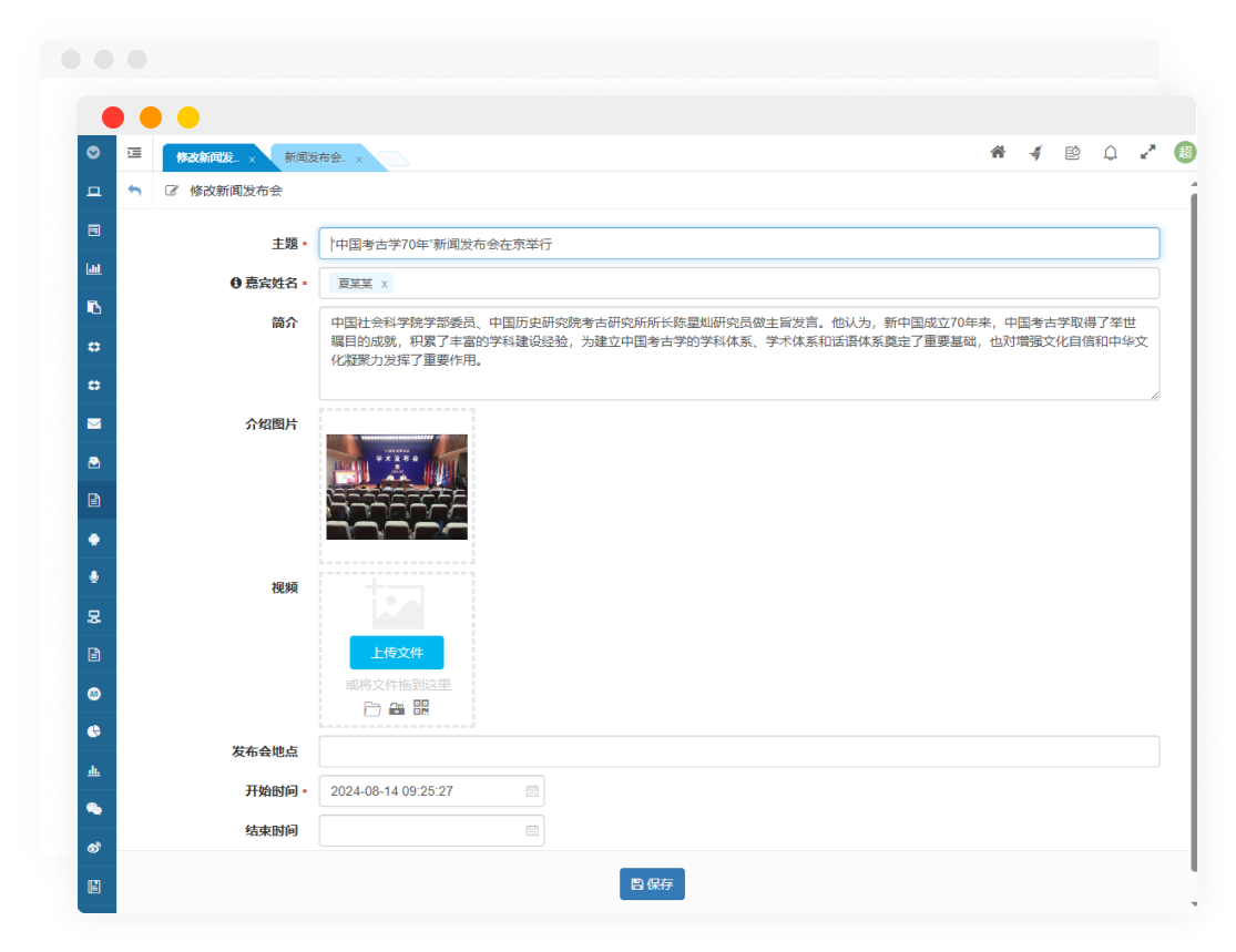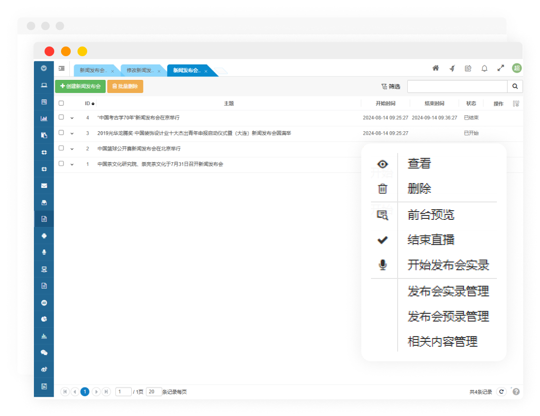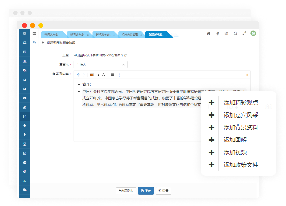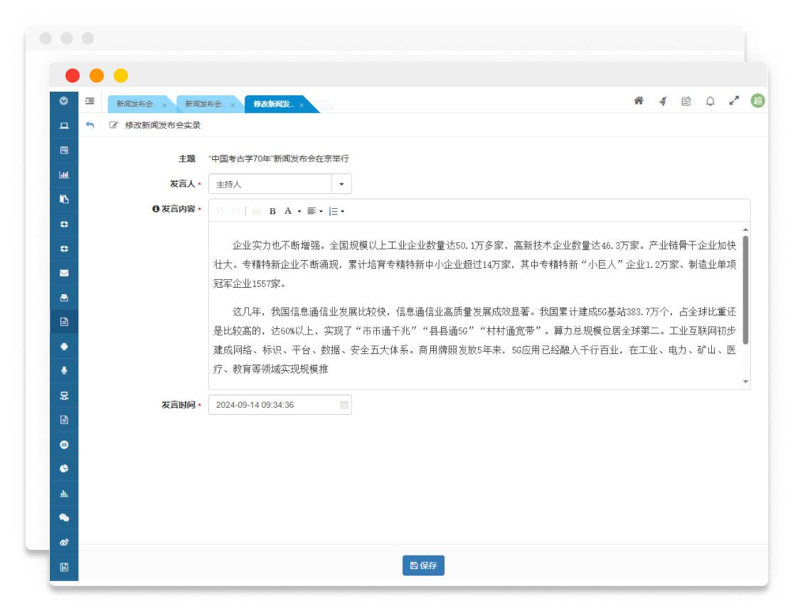 系統(tǒng)涵蓋新聞發(fā)布管理、發(fā)布會(huì)預(yù)錄管理、視頻直播與錄播、新聞圖文直播(實(shí)時(shí)推送)、網(wǎng)友提問、相關(guān)內(nèi)容管理與分類管理、新聞發(fā)布會(huì)配置等功能模塊。支持圖文直播與視頻直播功能,并內(nèi)置文字敏感詞過濾功能,確保發(fā)布內(nèi)容的安全與合規(guī)。