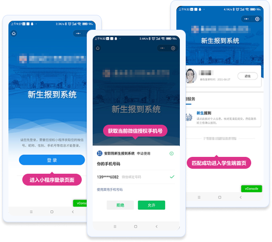 新生報到的學生端通過微信小程序實現。學生到校后,掃描學校公布的小程序二維碼,進入小程序。小程序會自動獲取當前微信綁定的手機號,并與新生報到數據進行匹配。