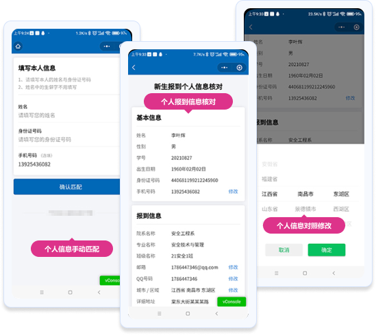 如果手機號未能與系統(tǒng)中的新生數據匹配,系統(tǒng)將提示學生在小程序頁面中填寫【姓名+身份證號+原手機號】進行數據匹配。匹配成功后,進入個人信息核對步驟。
