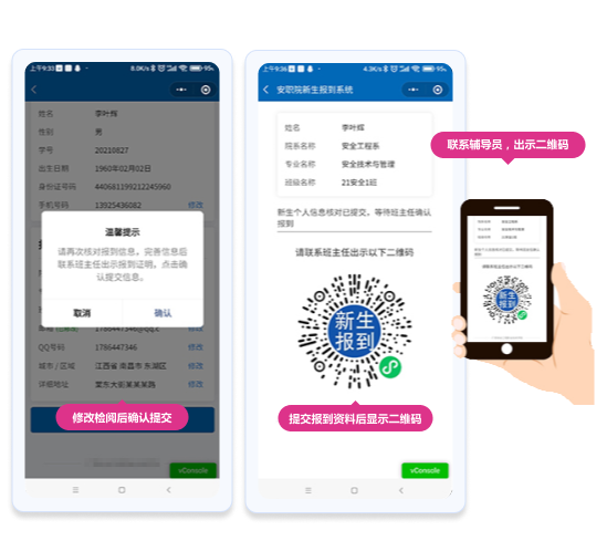 如果匹配成功,系統(tǒng)將顯示學生的院系、專業(yè)、班級、個人信息等內容。新生需核對個人信息,如有誤,可以根據實際情況進行修改,并提交更改。系統(tǒng)會彈出確認信息窗口,點擊【確認提交】按鈕后,系統(tǒng)會根據學生的身份證和當前時間生成一個二維碼。