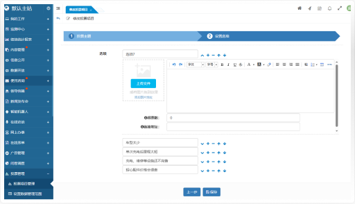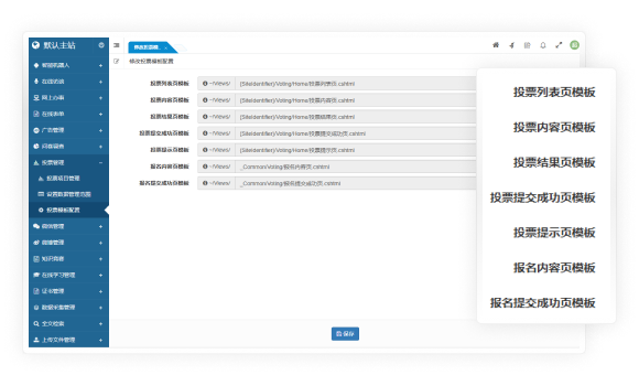 支持配置平臺(tái)/支持配置平臺(tái)/站點(diǎn)的投票列表頁(yè)、內(nèi)容頁(yè)、結(jié)果頁(yè)等頁(yè)面的默認(rèn)模板,并設(shè)置文件上傳等配置參數(shù)。