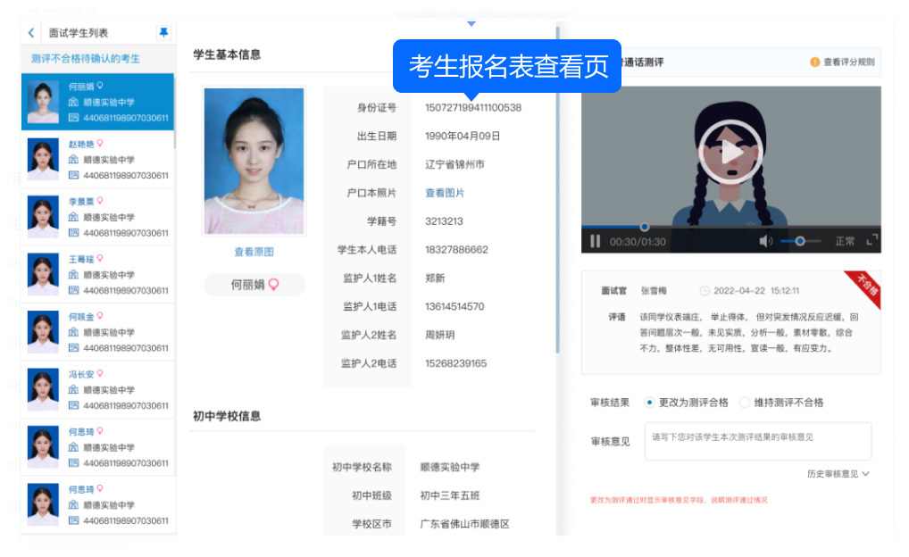 對(duì)于審核通過(guò)的考生,其查看頁(yè)面還會(huì)展示各測(cè)評(píng)項(xiàng)目的視頻上傳信息及測(cè)評(píng)結(jié)果,對(duì)于處于測(cè)評(píng)中狀態(tài)的考生,查看頁(yè)支持“允許考生重新上傳視頻”的功能,而對(duì)于測(cè)評(píng)中及后續(xù)狀態(tài)的考生,查看頁(yè)的測(cè)評(píng)項(xiàng)目還支持“重置測(cè)評(píng)結(jié)果”操作,以應(yīng)對(duì)某些特殊情況下的需求調(diào)整。
