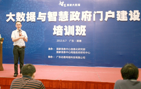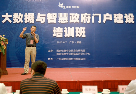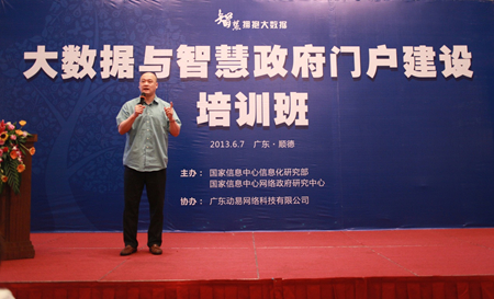 2013年6月7日,由國家信息中心信息化研究部、國家信息中心網絡政府研究中心(簡稱網研中心)主辦,廣東動易軟件股份有限公司承辦的“大數據與智慧政府門戶建設”培訓班在廣東順德舉行。來自廣東、湖南、貴州等地區(qū)60個市縣及部門的政府網站管理人員及動易公司相關負責人共140人參加了本次培訓。國家信息中心信息化研究部主任、網研中心主任張新紅以及網研中心副主任續(xù)揚,網研中心培訓認證部主任崔巖莉,咨詢部主任王建冬博士,廣東動易軟件股份有限公司總裁粟維勝先生等相關負責同志參加了此次會議。會議由網研中心副主任續(xù)揚主持。