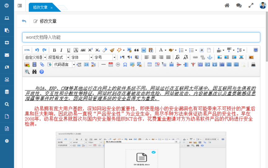全新架構(gòu)的動易SiteAzure 支持在線導(dǎo)入 Word 文檔,系統(tǒng)將自動對文檔內(nèi)容、字體格式、排版進行識別并保留 Word 文檔樣式,可在內(nèi)容編輯器中可視化展示;同時,Word 文檔中的圖片、表格等文件將自動上傳直接顯示在編輯器里,用戶可以在編輯器中繼續(xù)編輯或排版,也可以無需編輯排版而直接發(fā)布。發(fā)布的文章在網(wǎng)站前臺展示的效果和 Word 文檔中的效果一致。