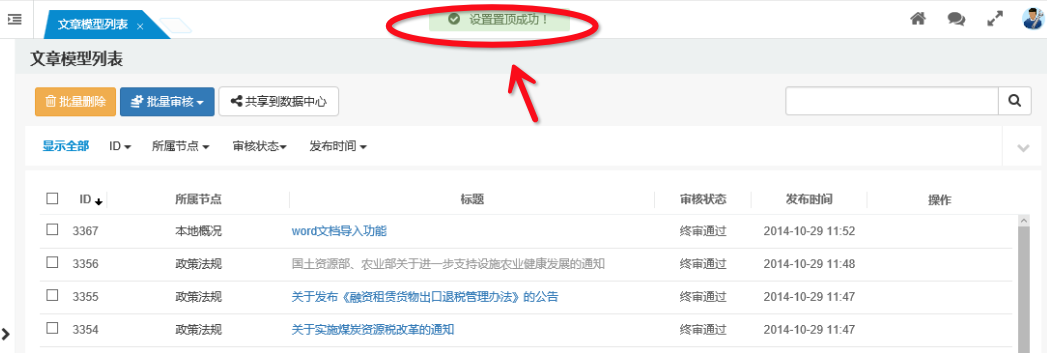 如下圖,以設(shè)置某篇文章為置頂文章,設(shè)置后在當(dāng)前頁面直接操作成功并提示操作信息。