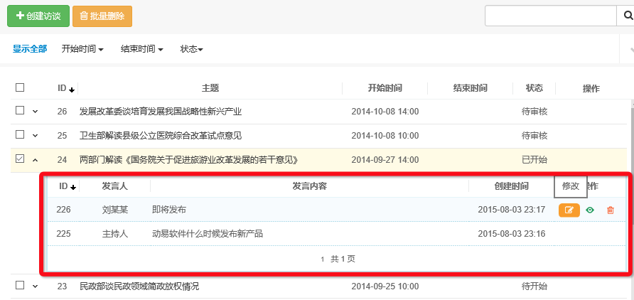 值得一提的是新信息列表還支持子表格的特性,能夠很好的幫助后臺(tái)管理人員查閱相關(guān)列表信息。下面以在線訪談功能的子表格特性為例,快速查閱單條訪談信息里的訪談實(shí)錄的內(nèi)容。