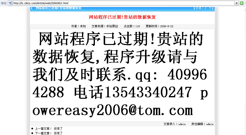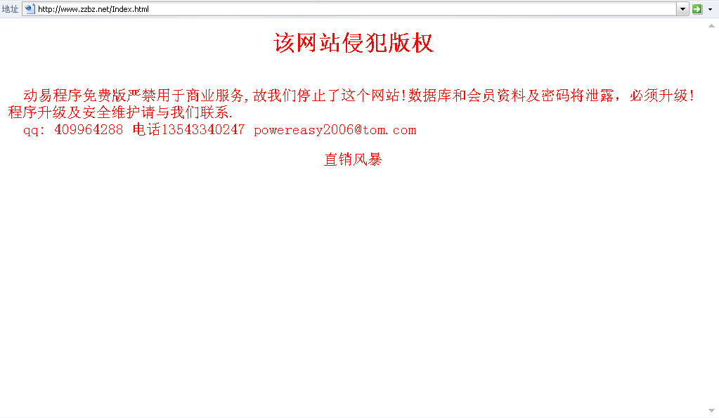 近日,動(dòng)易公司接到用戶反應(yīng)和舉報(bào),其使用的動(dòng)易普及版網(wǎng)站被黑客攻擊,黑客不僅在網(wǎng)站上標(biāo)注“因?yàn)閯?dòng)易免費(fèi)版嚴(yán)禁用于商業(yè)服務(wù),所以停止了此網(wǎng)站……”字樣,還破壞了網(wǎng)站數(shù)據(jù),且留有QQ、電話、郵箱等聯(lián)系方式要求站長與之聯(lián)系進(jìn)行程序上的升級(jí),并注明“直銷風(fēng)暴”。(見附圖)