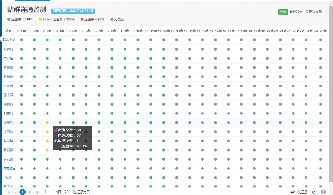 采用仿交換機面板的亮燈圖方式顯示所有站點的連通監(jiān)測結果,可直觀了解到各時間段連通情況。