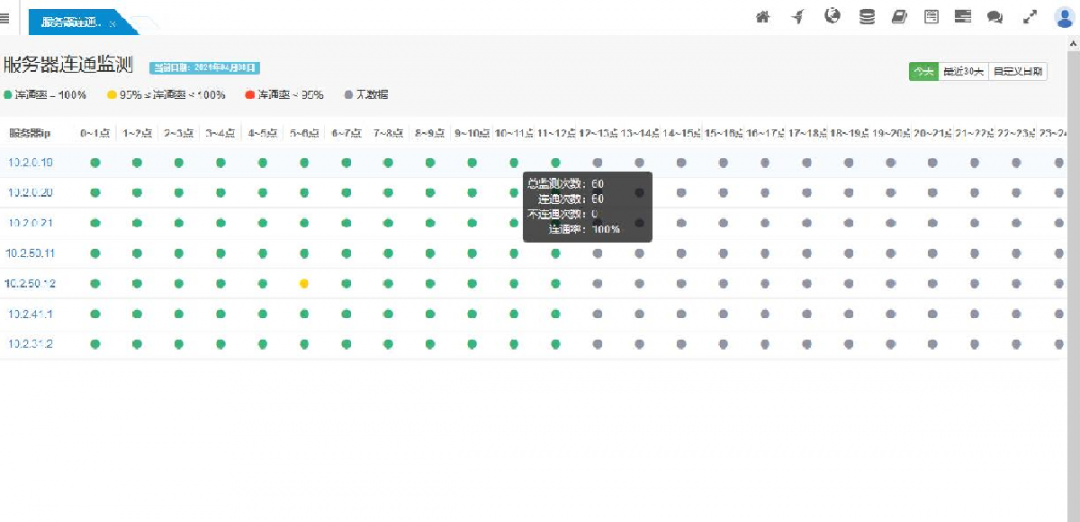 采用仿交換機面板的亮燈圖方式顯示所有服務器的連通監(jiān)測結果,可以直觀的了解到各時間段連通情況。