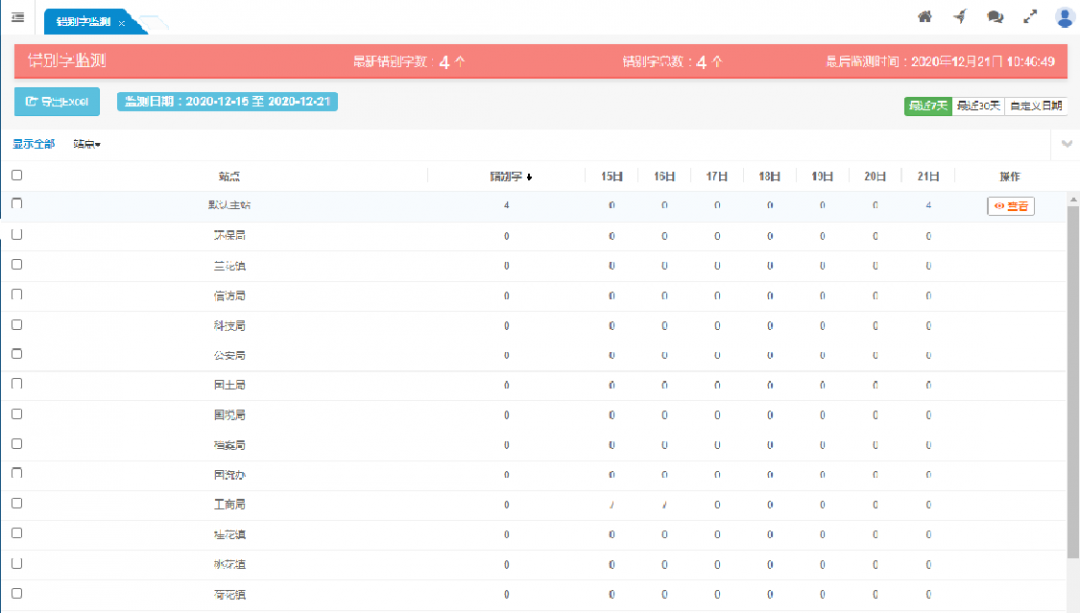 按站點顯示各站點的錯別字監(jiān)測情況。
