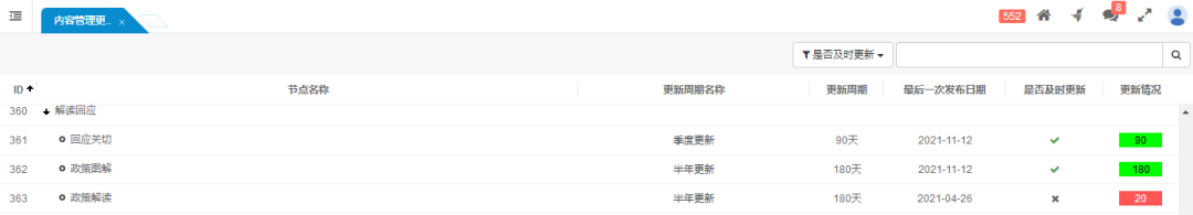系統(tǒng)提供了監(jiān)測中心及績效統(tǒng)計(jì)報(bào)表功能,可以對政策文件\政策解讀的發(fā)布情況進(jìn)行統(tǒng)計(jì)、對更新情況進(jìn)行日常監(jiān)測。此外,系統(tǒng)還提供內(nèi)容更新預(yù)警功能,擁有權(quán)限的管理員可以收到信息提醒通知。