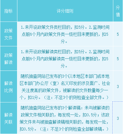 政策解讀是政府網(wǎng)站績效考核的一個(gè)重要部分,涉及考核分值16分(政策文件+政策解讀+解讀比例+解讀關(guān)聯(lián))。關(guān)于政策解讀的主要內(nèi)容, 在2019年4月1日 《國務(wù)院辦公廳秘書局關(guān)于印發(fā)政府網(wǎng)站與政務(wù)新媒體檢查指標(biāo)、監(jiān)管工作年度考核指標(biāo)的通知》可以看到: