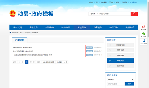 解讀材料上應(yīng)隨政策文件同步在政府網(wǎng)站予以公開發(fā)布。在動(dòng)易系統(tǒng)中,管理員發(fā)布政策解讀時(shí),可將解讀材料和被解讀的政策文件相互關(guān)聯(lián)。
