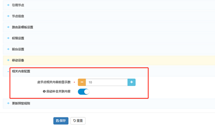 系統(tǒng)提供了“相關(guān)內(nèi)容補(bǔ)全”功能。開啟這個(gè)功能后,當(dāng)手工設(shè)置的相關(guān)內(nèi)容數(shù)量達(dá)不到在此節(jié)點(diǎn)相關(guān)內(nèi)容的顯示數(shù),或沒有手工設(shè)置相關(guān)內(nèi)容時(shí),系統(tǒng)自動(dòng)通過全文檢索功能找到包含了在“關(guān)鍵詞”字段中設(shè)置的關(guān)鍵詞內(nèi)容,并填充到相關(guān)內(nèi)容列表中,以盡量保證足額顯示相關(guān)內(nèi)容。