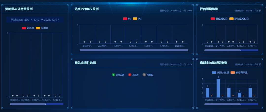 使用運用數(shù)據(jù)可視化技術,對整個站群的運維情況和日常檢測情況通過可視化大屏的方式進行呈現(xiàn),提高相關數(shù)據(jù)檢測頻率,實現(xiàn)對僵尸欄目、欄目數(shù)據(jù)更新情況、錯別字等數(shù)據(jù)進行跟蹤,數(shù)據(jù)實時反饋,實現(xiàn)各項數(shù)據(jù)運行態(tài)勢更加安全可控。