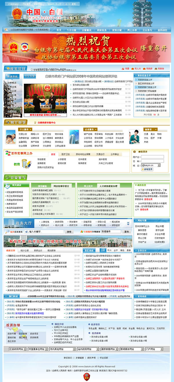 由工業(yè)和信息化部主辦、中國(guó)軟件評(píng)測(cè)中心承辦的第七屆(2008)中國(guó)政府網(wǎng)站績(jī)效評(píng)估結(jié)果發(fā)布會(huì)在北京召開。中國(guó)政府網(wǎng)站績(jī)效評(píng)估工作包括了指標(biāo)體系研究制訂、網(wǎng)站建設(shè)專題活動(dòng)、日常監(jiān)測(cè)、用戶認(rèn)知度和滿意度調(diào)查、綜合評(píng)估及結(jié)果發(fā)布等 5 方面主要內(nèi)容。白銀市人民政府門戶網(wǎng)站在此次2008年中國(guó)政府網(wǎng)站績(jī)效評(píng)估活動(dòng)中獲得了甘肅省第一名西北區(qū)第六名的喜人成績(jī)。