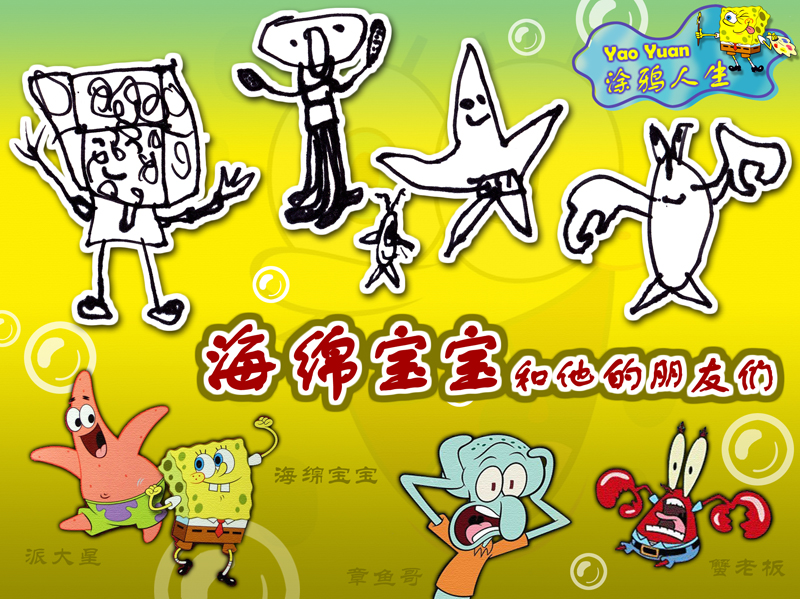 兒子看過了許多動畫片,《海綿寶寶》就是其中百看不厭的一部。在看完電視后,電視中的主人公就成了他繪畫的對象,電視中的劇情就成了他繪畫的主題。上次收到LP寄來的這二幅畫,就是他看過這動畫片后信手拈來的涂鴉:)孩子們都喜歡看動畫片,因為他們從中可以享受到許多美好、無厘頭的樂趣,這就是孩子純真的世界。