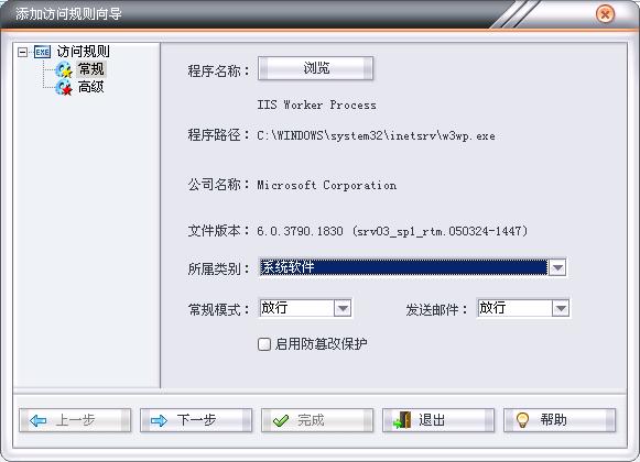 [2]在“常規(guī)”選項下,選擇程序:“C:\windows\system32\inetsrv\w3wp.exe”,在“所屬類別”選擇“系統(tǒng)軟件”(可選)