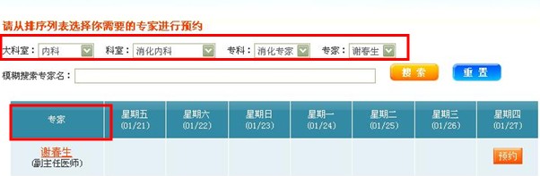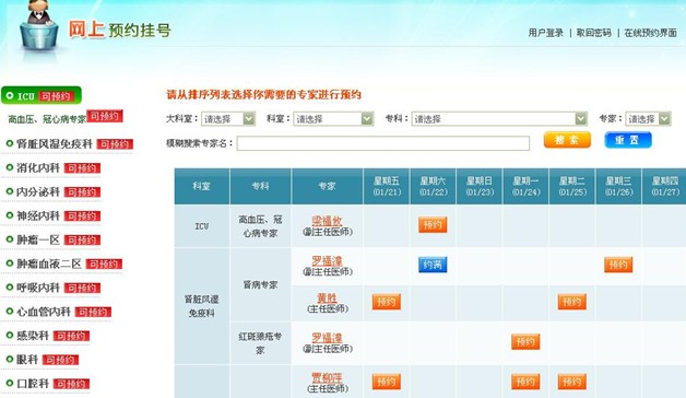 經(jīng)過(guò)上一步的操作,我們現(xiàn)在已經(jīng)進(jìn)入預(yù)約頁(yè)面了,大家可以在下面的截圖中看到,頁(yè)面呈現(xiàn)出了科室、專(zhuān)家的排班時(shí)間、是否可預(yù)約等信息,我們可以進(jìn)行仔細(xì)的查看,根據(jù)頁(yè)面提供的信息確定我們需要預(yù)約的專(zhuān)家情況。