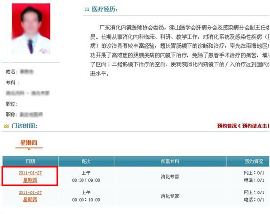 進(jìn)入預(yù)約界面后,系統(tǒng)會(huì)自動(dòng)顯示出專(zhuān)家的醫(yī)療經(jīng)歷、門(mén)診時(shí)間等信息供我們查看,只要點(diǎn)擊下圖紅框中的預(yù)約日期后,根據(jù)下一步的提示進(jìn)行簡(jiǎn)單操作,便完成了整個(gè)預(yù)約掛號(hào)的流程,接下來(lái)你要做的就是準(zhǔn)時(shí)赴約進(jìn)行診療了。