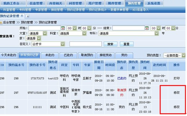 在開(kāi)診當(dāng)天,醫(yī)院醫(yī)務(wù)人員可以根據(jù)實(shí)際門(mén)診赴約的情況進(jìn)行預(yù)約信息的修改,可以為準(zhǔn)時(shí)赴約的患者打印出預(yù)約單并將信息改為“已赴約”,將未赴約的患者信息改為“爽約”……系統(tǒng)將可以協(xié)助醫(yī)院對(duì)全部的預(yù)約信息進(jìn)行有效的管理和歸類(lèi)。