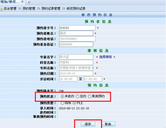 進(jìn)入修改頁(yè)面后可以看到系統(tǒng)會(huì)呈現(xiàn)出我們所需要的全面預(yù)約信息,我們只要將“預(yù)約狀態(tài)”修改為相應(yīng)狀態(tài),然后點(diǎn)擊“保存”就可以了。
