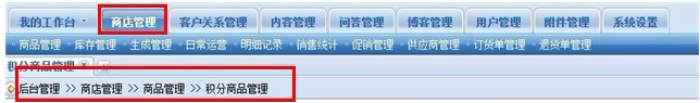 首先進入系統(tǒng)后臺“商品管理”界面,點擊“積分商品管理”。