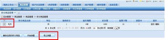 接下來,在積分商品管理中我們可以看到商品信息的最下方有積分商品管理的操作鍵:“開始銷售”和“停止銷售”,勾選商品前面的小方框后,單擊“停止銷售”便可停止積分商品的銷售功能。