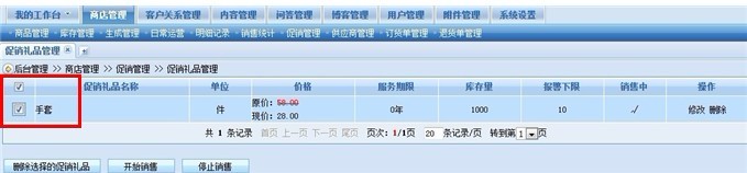 接下來,在促銷商品管理中我們可以看到商品信息的最下方有促銷商品管理的操作鍵:“開始銷售”和“停止銷售”,勾選商品前面的小方框后,單擊“停止銷售”便可停止促銷商品的銷售功能。