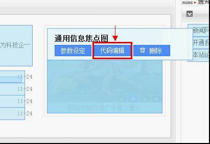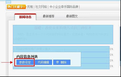 進(jìn)入模板可視塊編輯頁面,鼠標(biāo)移動到需要進(jìn)行修改標(biāo)簽參數(shù)的模塊上,頁面即出現(xiàn)“代碼編輯”選項(xiàng),點(diǎn)擊出現(xiàn)代碼修改編輯框,修改后可在界面中看到實(shí)際效果。點(diǎn)擊“參數(shù)設(shè)定”選項(xiàng)。