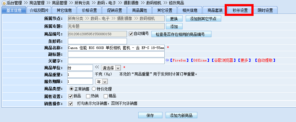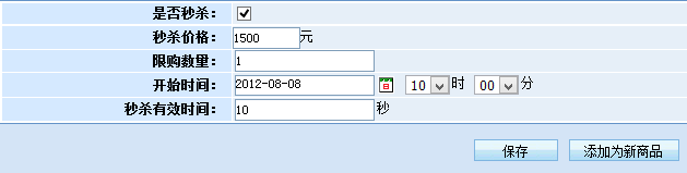 點(diǎn)擊“秒殺設(shè)置”功能選項(xiàng)卡,進(jìn)入秒殺功能設(shè)置界面,并開(kāi)啟秒殺,如下圖: