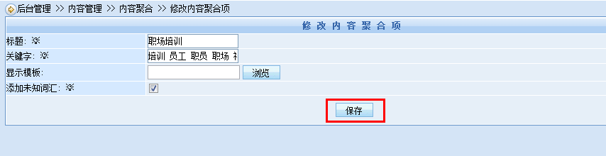 系統(tǒng)后臺,點擊“添加內(nèi)容聚合項”,在出現(xiàn)在頁面中,填寫標題、關(guān)鍵字及選擇模板。選擇是否需要添加未知詞匯到字典中。點擊“保存”功能按鈕,你所設(shè)置內(nèi)容聚合即可顯示在前臺頁面中。
