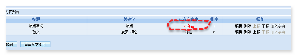 一些新產(chǎn)生的詞匯或者特定名詞不存在與字典中,則會在管理界面中顯示。單擊操作中的“加入字典”按鈕即可將關(guān)鍵字加入到字典中。最后點擊重建全文索引,并重新建立相關(guān)的全文索引即可。