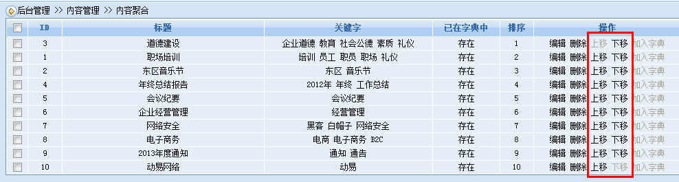 網(wǎng)站管理者可以隨時按內(nèi)容重要性調(diào)整內(nèi)容的排序,在后臺中通過操作區(qū)域中的上移下移按鈕可以設(shè)置內(nèi)容聚合的排序規(guī)則。調(diào)整后的排序,將同步在前臺顯示。