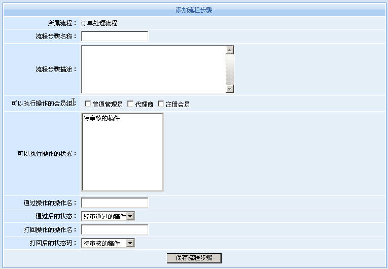 在動(dòng)易SiteFactory 中,我們只要?jiǎng)?chuàng)建幾個(gè)用戶組,例如信息組、采購(gòu)組、物流組這樣幾個(gè)組,然后創(chuàng)建待處理、配貨中、已配貨、發(fā)貨中、已發(fā)貨等幾個(gè)狀態(tài)碼。然后創(chuàng)建“訂單處理流程”,設(shè)置每個(gè)步驟中可操作的用戶組、經(jīng)過(guò)該步驟處理訂單狀態(tài)發(fā)生的變化等。就可以完全實(shí)現(xiàn)和互動(dòng)出版社一樣的工作流程。