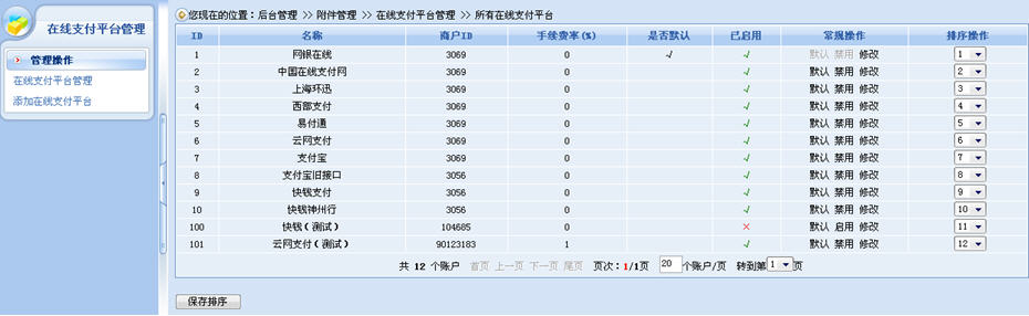 在動(dòng)易eShop2007里,系統(tǒng)可添加的支付平臺(tái)數(shù)量是沒(méi)有上限的,網(wǎng)店可以任意添加多個(gè)支付平臺(tái)。此外,我們還可對(duì)支付平臺(tái)的先后順序進(jìn)行排序管理。