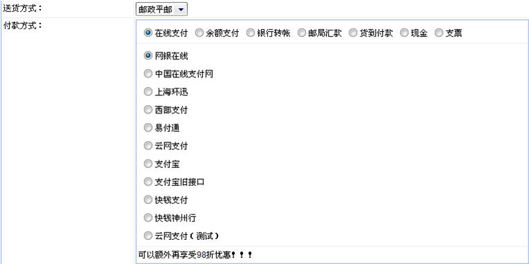 在動(dòng)易eShop 2007,網(wǎng)店顧客可在所有支付平臺(tái)中任意選擇一種來(lái)進(jìn)行貨款支付,見(jiàn)下圖: