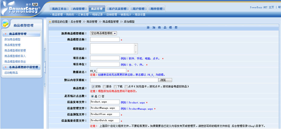 動易eShop2007的商品添加采用了這樣的步驟:1、添加商品模型;2、添加商品節(jié)點與欄目;3、添加商品。商品模型的定義是商品上架的首要一步:商店管理——商店設置——商品模型管理——添加商品模型。